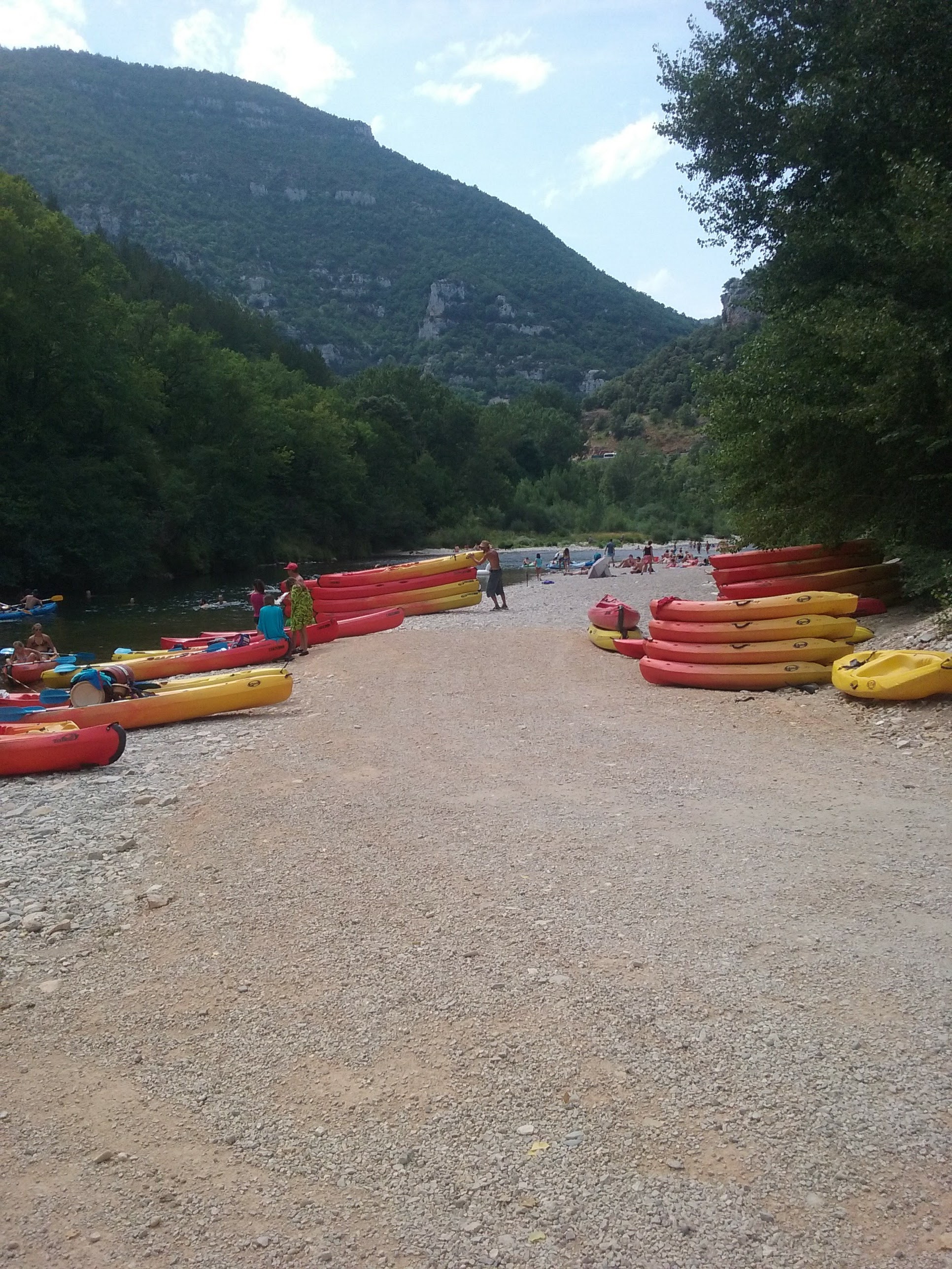 Grosse usine à canoë. L'arrivée à Sainte-Enimie s'est transformé en cauchemar car personne ne nous a dit de traverser la digue à pied. J'ai dévalé dans les cailloux...