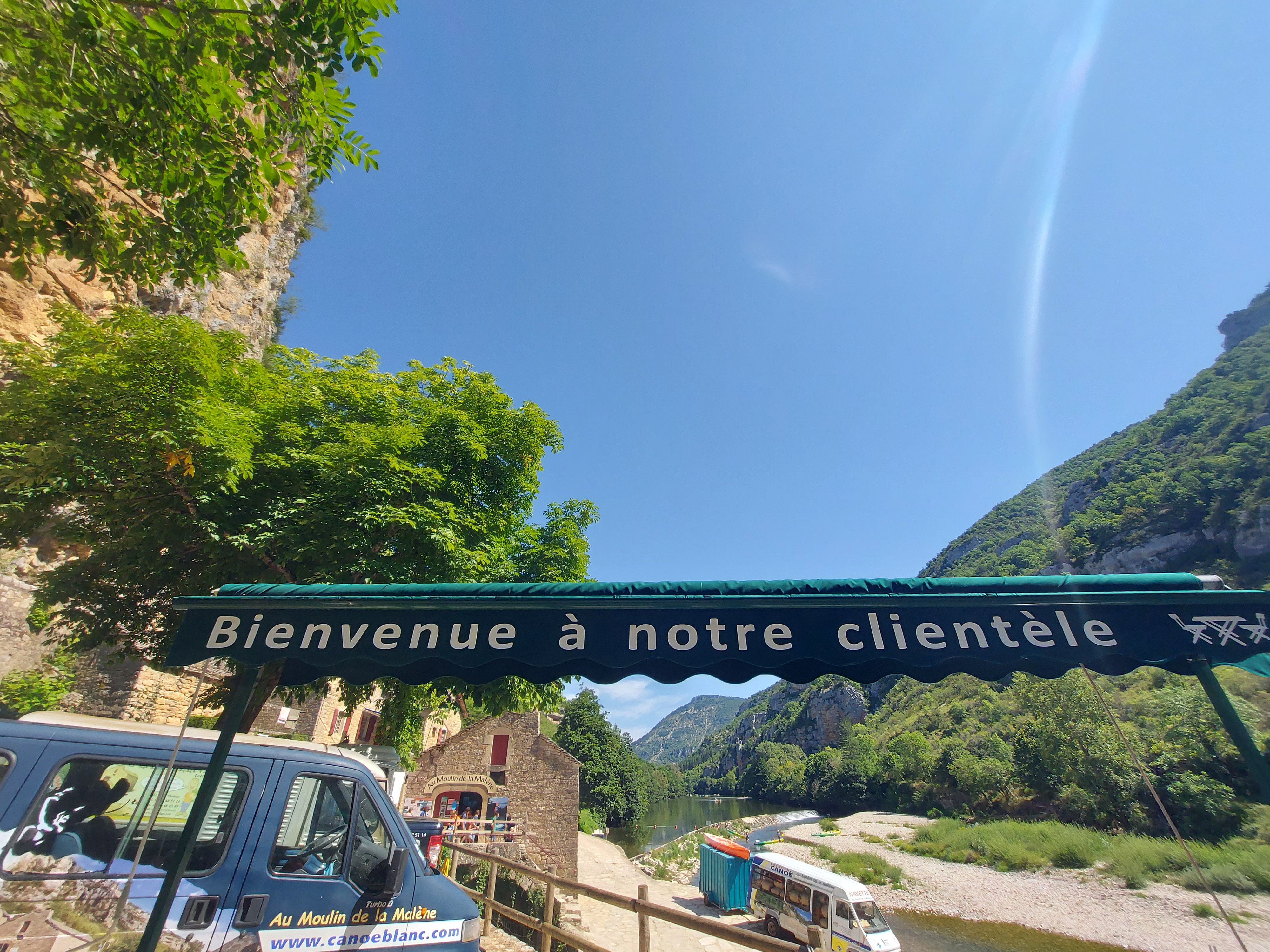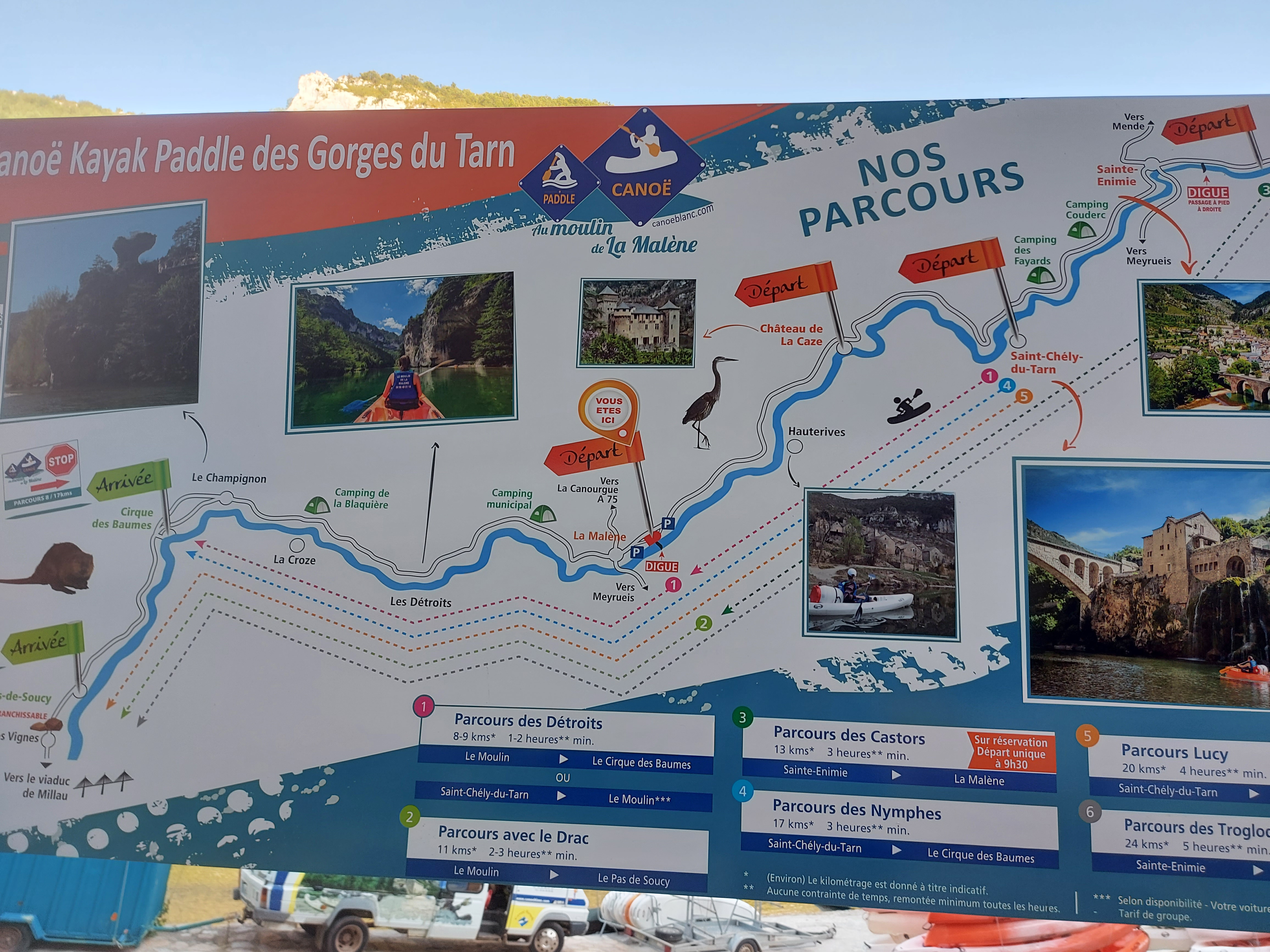 Le Moulin de la Malène est un bon loueur de canoë si vous cherchez à faire une descente du Tarn. Lorsque je les ai eu au téléphone pour me renseigner sur les différents parcours, ils ont pris le temps de répondre à mes différentes questions. Sur place, le personnel est agréable et nous explique les spécificités de chaque parcours. Le point de rendez-vous est à la Malène mais ils desservent avec leur minibus de Sainte-Énimie au Pas de Soucy. Plusieurs remarques : - La personne qui conduit le minibus m'a précisé que l'affluence était monstre entre la deuxième quinzaine de juillet et la première quinzaine d'août. Il faut privilégier avant et après cette période pour faire une descente tranquille sur le Tarn (tout début juillet pour nous, conditions idéales) - Le Tarn a un faible débit en été, il y a donc globalement peu de courant, sauf à partir de la Malène. Il faut pas mal pagayer pour les parcours qui commencent avant, on ne peut pas uniquement se laisser porter par le courant. - De ce que nous avons vu, c'est sur le tronçon Saint-Chély-du-Tarn/Cirques des Baumes qu'il y a le vues les plus spectaculaires (parcours d'une durée de 3h sans les pauses et en pagayant) Merci encore à vous !