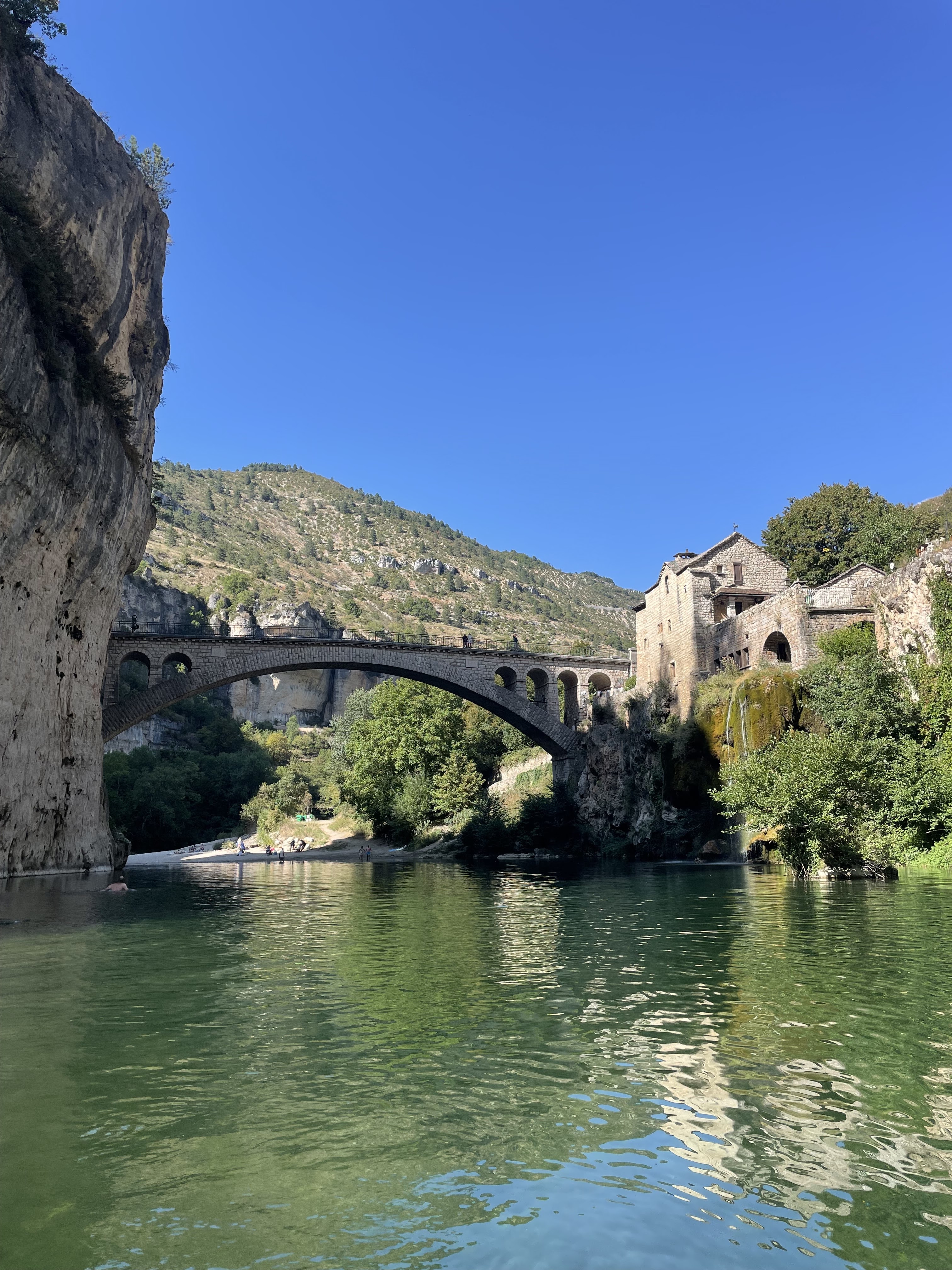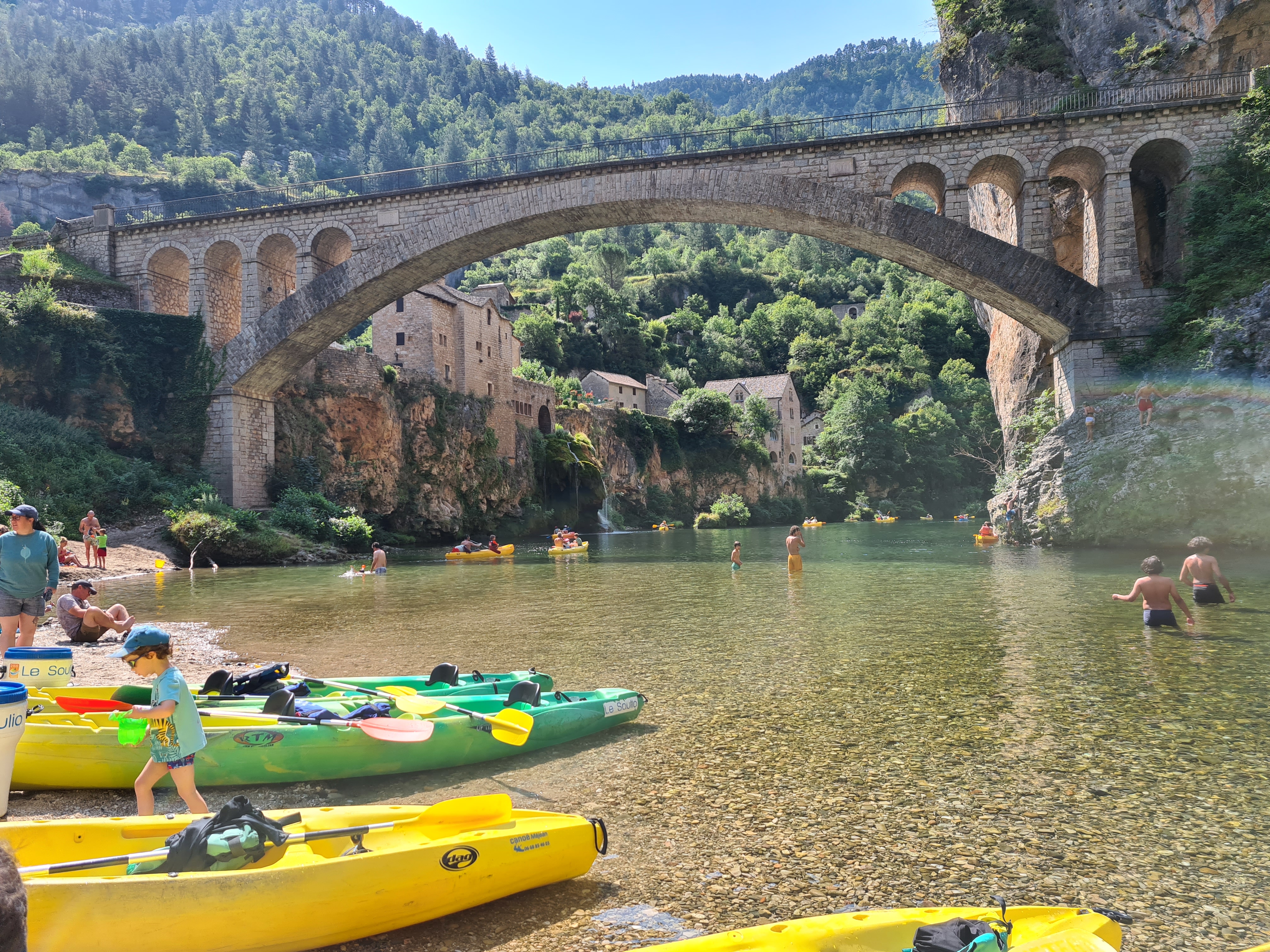 Balade en famille. Quelle organisation pour les retours! Sous une telle chaleur l’équipe est pleine de courage et de savoir faire pour monter tous les navires dans un temps raisonnable. La descente du Tarn entre st enimie et la malene est un peu laborieuse en fin d’été (peu d’eau). Le pont de st Chely est magnifique et la zone alentour assez extra ordinaire. J’avais plus apprécié la descente au mois de Juin (plus d’eau et moi d de monde)