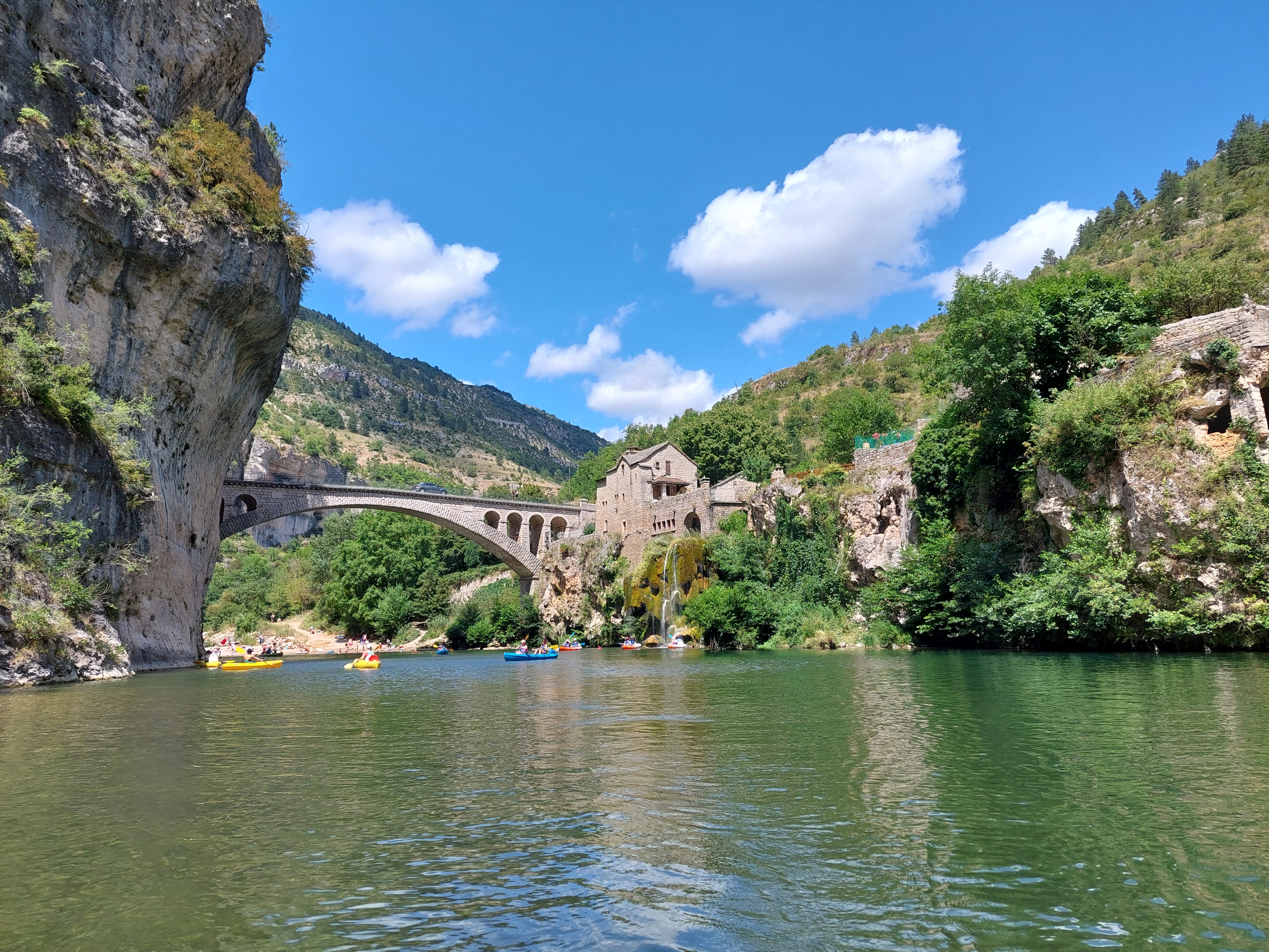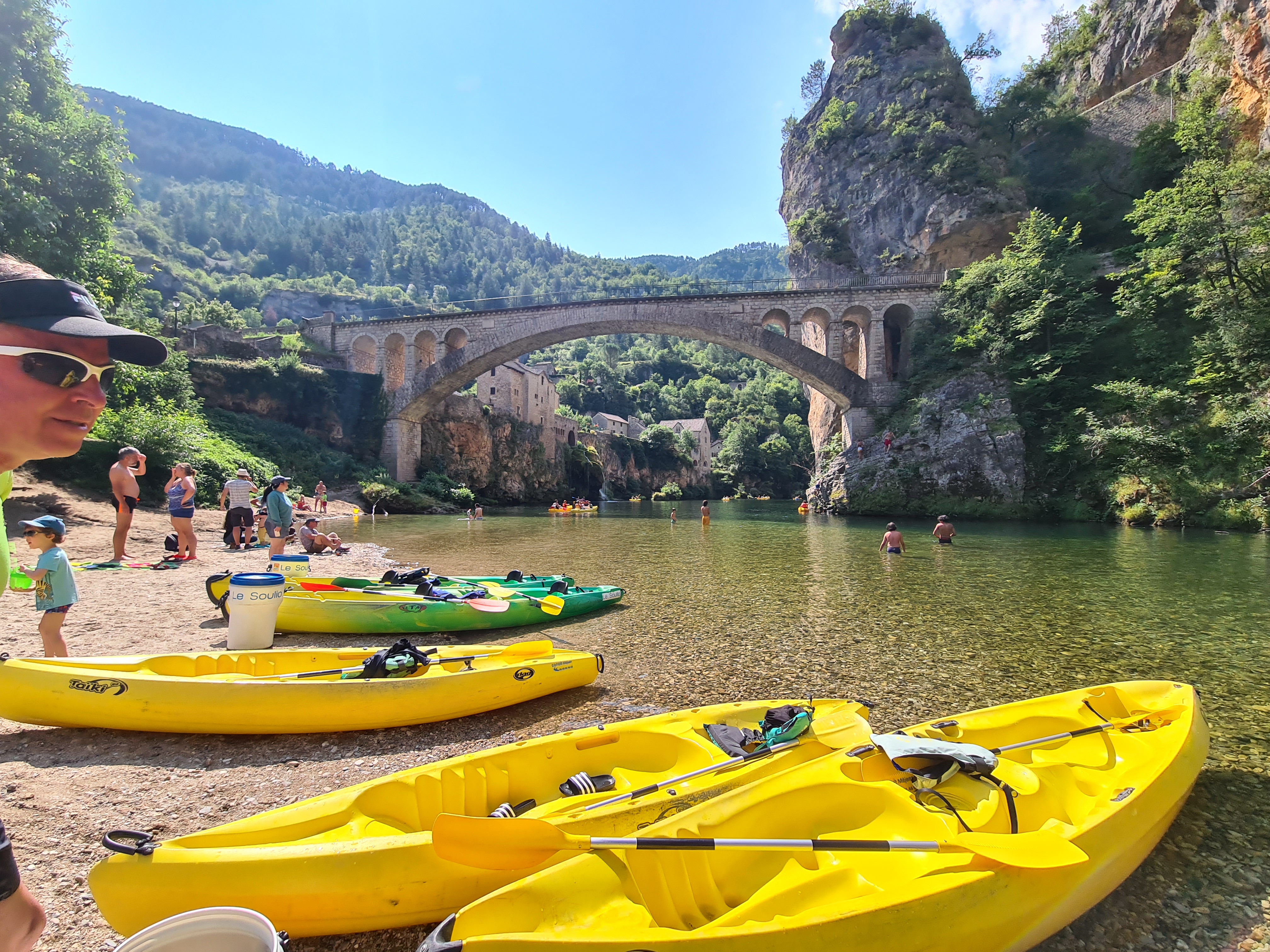 Bon accueil, Ste-Enimie est juste parfais pour amorcer une descente des Gorges du Tarn. J’ai fais 21 km , avec malgré l’avis de Méjean canoé qu’il y a de l’eau cet été, un niveau d’eau assez bas. Suffisant pour ne pas trop devoir tirer le canoé, mais relativement bas et de fait ça demande de pagayer pas mal pour avancer. 21 km c’est long , en particulier pour les novices ce qui n’est pas mon cas, et pourtant je regrette de ne pas avoir fait les 24 jusqu’au « pas de Souci » . (Partis vers 09h30 j’étais en bas à 15h30 avec juste deux arrêts St-Chély du Tarn , le coin le plus magnifique des gorges et La Malène pour la pause de midi vers 13h00) Pour ménager ses muscles et plus profiter des baignades le parcours « La Malène » - « Le Pas-de-Souci » est une excellente option (exit St-Chély). Enfin, penser que s’il y a du vent (ce qui étais le cas), avec le niveau d’eau actuel, il faut beaucoup plus pagayer et les novices ont tendances à plus « tourner en rond » ce qui augmente l’effort à fournir! Ensuite, depuis 35 ans que je fréquente les gorges du Tarn, une douzaine de parcours à mon actif sur le Tarn. J’ai depuis au moins vingt ans , toujours louer chez Mejean car très bon service et Ste-Enimie est un lieu de départ idéal pour les différents parcours sur le haut Tarn. Pour terminer, le seul regret que l’on puisse avoir quand on a connu les Gorges il y a 35 ans déjà , les bons vieux canoë « pirogues » qui étaient plus difficiles à manier pour les novices, qui chaviraient plus souvent de fait. Et qu’il fallait ensuite vider sur la berge. Mais avaient une bien meilleure hydrodynamique , ils étaient plus rapides, nécessitaient moins de coup de pagaie et de fait d’effort. Les insubmersibles actuels chavirent bien moins souvent , mais ils naviguent mal. L’intérêt du tourisme de masse a pousser les loueurs vers le choix de ces insubmersibles. Dommage qu’on ne puisse plus louer un vrai canoë! Et un conseil averti: pour profiter au mieux de la journée , quel que soit le parcours choisi; démarrer le plus tôt possible ! Y’a moins de monde, on peut plus tranquillement s’accoutumer a la pratique du canoë et on profite de cette nature grandiose dans le calme et le silence.