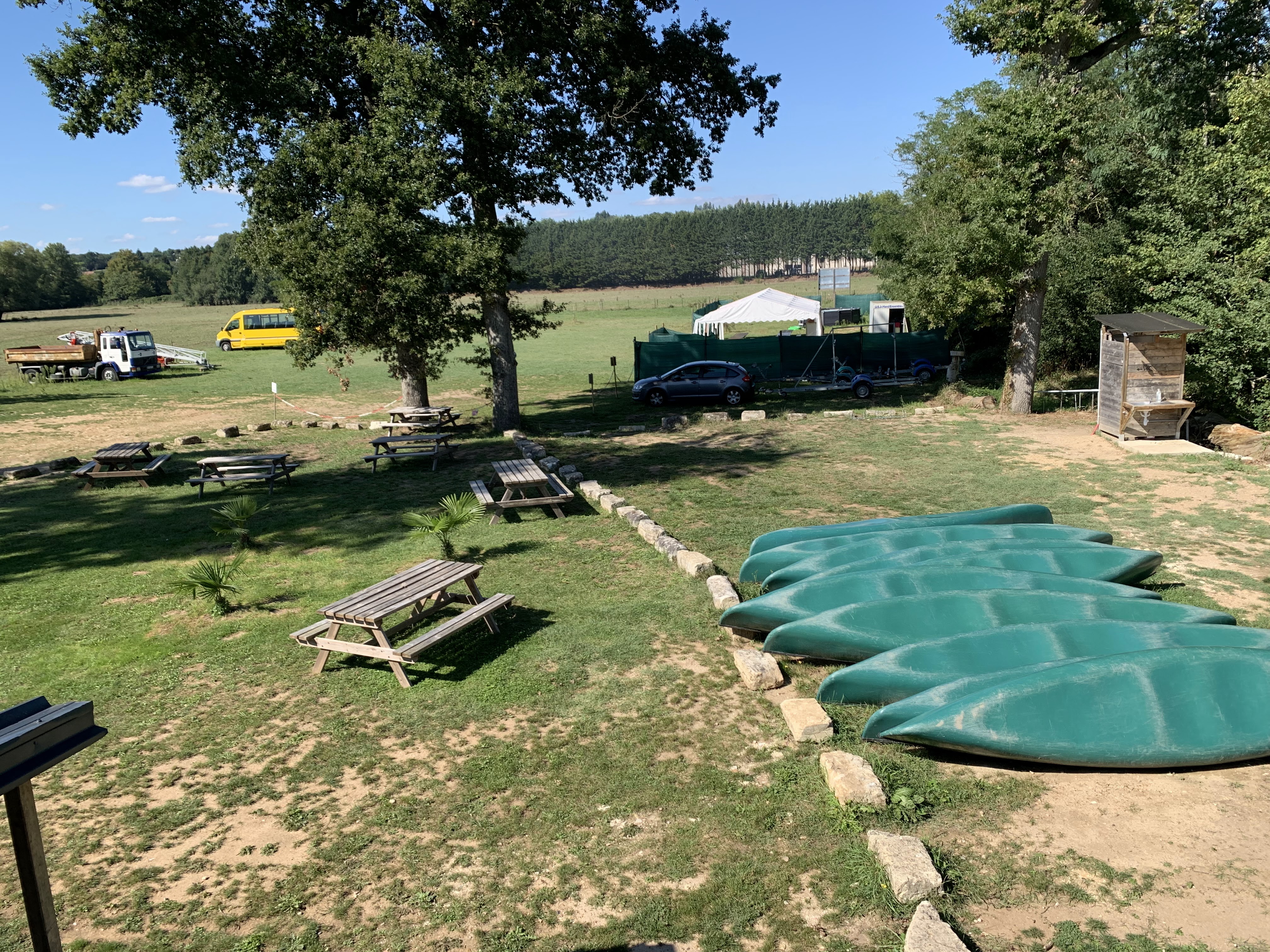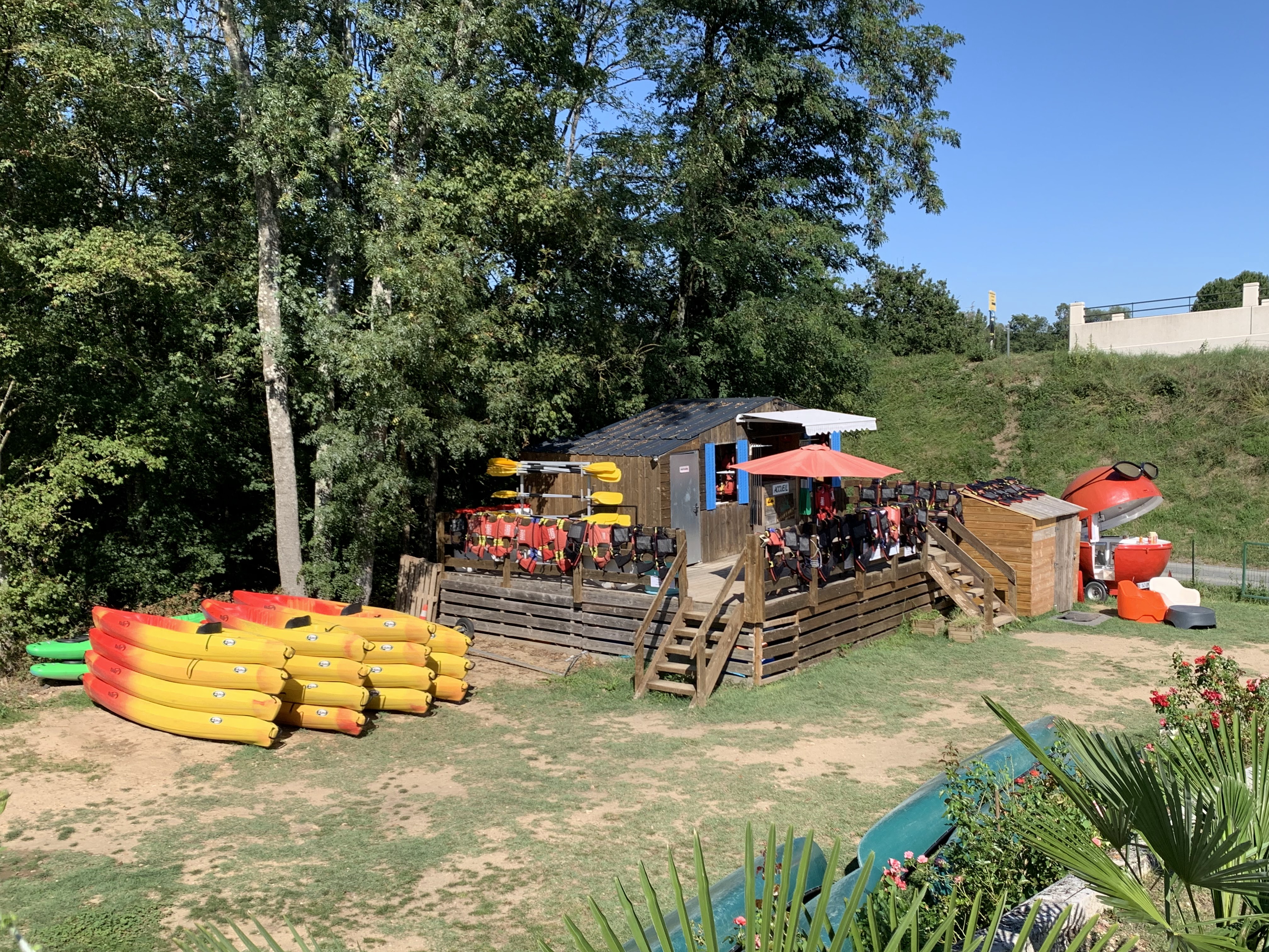 Emplacement idéal ! Aire de pique nique bien equipee, et même petit bar où un verre est offert apres la balade sur l'eau, et avec le sourire ! Acceuil tres agreable, prix attractifs 4 enfants et 2 adultes, kayak et canoes. Sublime balade ! Pas de temps limité Super !